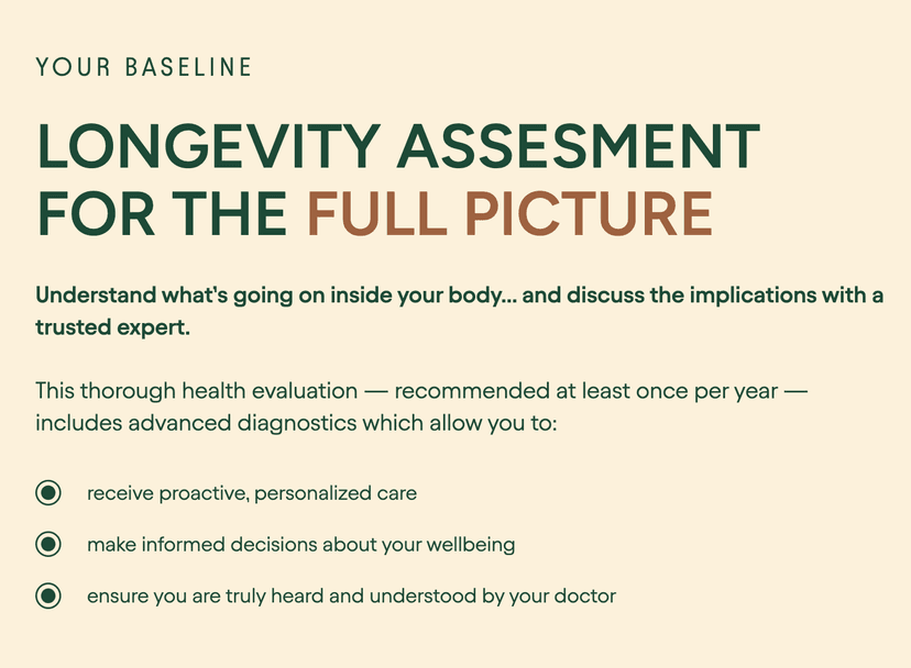 Our membership includes a thorough Longevity Assessment, recommended at least once a year, which provides a complete picture of your health. This assessment includes advanced diagnostics such as Dexa scans, VO2 max testing, and an extensive biomarker blood panel, all aimed at identifying potential health risks and creating a personalized care plan.